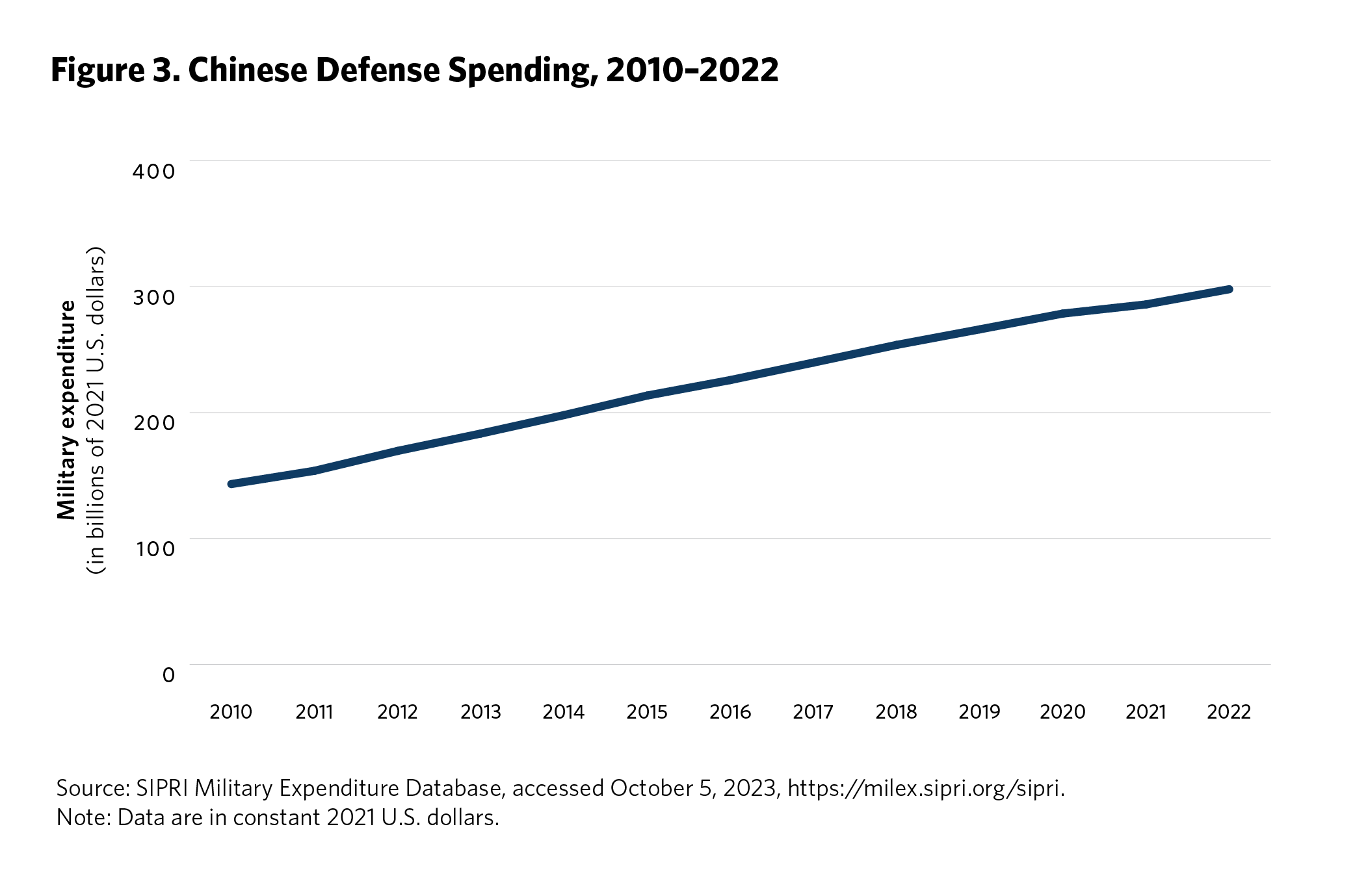 The growth of China’s missile forces in the post–Cold War era has further coincided with Beijing’s broader economic growth and concomitant increases in military spending. Moreover, while China’s longer-range missiles during the Cold War were exclusively nuclear, over the last three decades, Beijing has built up a potent force of conventional and dual-capable missiles up through intermediate ranges.2 During the early 1990s, China began to introduce new, short-range missiles, such as the conventional, single-stage, solid-propellant DF-15, to bases in range of Taiwan. An acceleration in the growth of certain classes of Chinese missiles in the late 2010s and early 2020s, such as hypersonic missiles and intermediate-range missiles, has coincided with growing threat perceptions vis-à-vis the United States. While China’s surface-attack missile forces are composed primarily of ballistic missiles, including ballistic missiles with MaRVs, Beijing has also pursued and deployed cruise missiles in land-attack roles.3 Finally, China is the first country to have deployed an operational hypersonic boost-glide vehicle-equipped missile, the DF-17, for a theater mission.4 The contours of Chinese missile forces continue to shift amid a broader military modernization and spending effort to realize, by the centennial of the People’s Republic’s founding in 2049, what Chinese President Xi Jinping has called a “world-class military" (see figure 3).5